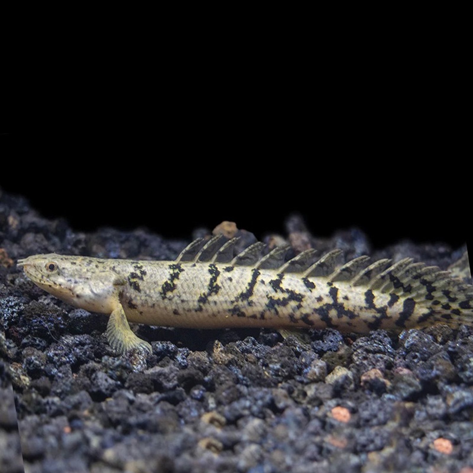 Native to the Congo River Basin, Delhezi Bichirs are slow-moving, nocturnal bottom-dwellers that thrive in low-light, well-oxygenated tanks with plenty of hiding spots like rocks, driftwood, and caves. This species is known for being peaceful with similar-sized tankmates but should not be kept with small fish that can fit into its mouth.